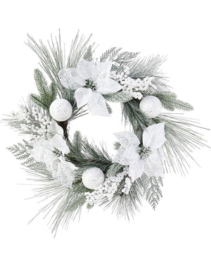 Transform your home into a winter wonderland with our White Snow Poinsettia Wreath 58cm. At 58cm in diameter, this exquisite artificial plant wreath captures the magic of a snowy Christmas morning and brings it to your doorstep. Adorned with delicate white berries, glistening poinsettia flowers with a touch of glitter, and a lush variety of green pine leaves dusted with a gentle white 'snow' detail, this wreath is a vision of pure elegance. Each element is carefully crafted to evoke the serene beauty of the season. The wreath is completed with small white bauble accents, adding a whimsical touch to this enchanting, wintery wreath. Hang it on your door to welcome guests with a sense of winter wonder, or display it indoors as a stunning centrepiece to infuse your space with the spirit of Christmas. Combine with our range of Christmas party supplies and decor including swags, wreaths, ornaments and more.