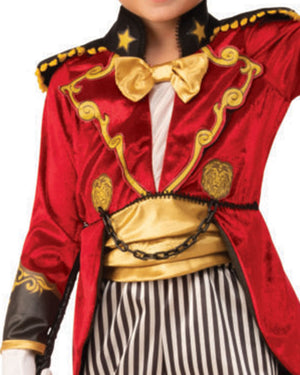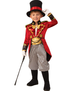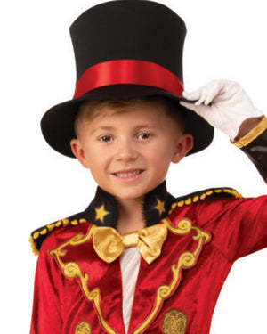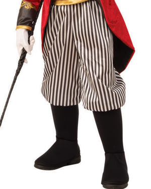 Have your little performer run his own circus when he steps to the podium dressed in this sharp Circus Ringmaster Boys Costume. This star quality costume includes a red waistcoat style jacket with an attached high waist gold cummerbund in the front and printed gold detailing along front and lapels. Along the shoulders are black 3D attached epaulettes with gold trim incorporated into the high neck black collar with printed stars. Along the front is also a faux black chain that drapes over the cummerbund. A pair of black and white pinstripe loose fitting pants with attached black boot tops with elastic straps for under their shoes and to complete the character is a black top hat with a red satin band and a firm top to help keep its shape. A great option for a number of themed costume parties for if your little boy decides he doesn't want to dress scary for Halloween this year.