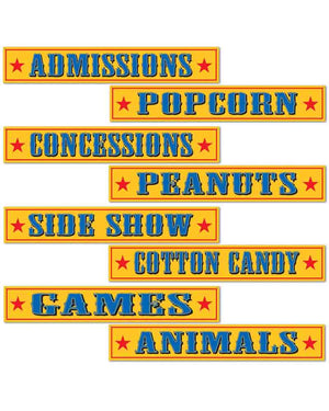 Set the scene for your Circus theme party with these Circus Sign Cutouts. These sign cutouts are made of cardstock material and are printed on both sides. The signs are yellow with blue phrases, and red stars are on each side. Each side has a unique design featuring Admissions/Popcorn, Concessions/Peanuts, Side Show/Cotton Candy, Games/Animals.