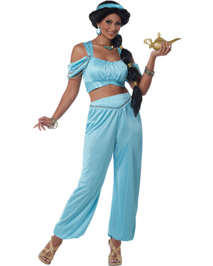 Look just like a beautiful princess in this gorgeous Classic Arabian Princess Womens Costume. This costume comes with a light blue cropped top with thick straps and gold detailing and a pair of matching blue harem pants with gold detail around the waist. There is a matching blue headband to finish the look. Grab your lamp and let the genie inside grant your three wishes.