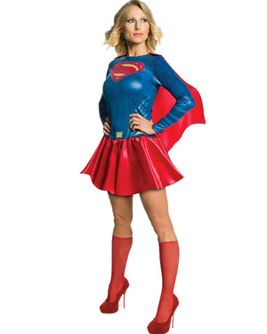 Zoom into the party as one of DC comic's strongest female characters and Superman's cousin from his home planet of Krypton. This Classic Supergirl Deluxe Womens Costume resembles Supergirl or her birth name Zor-El in her superhero costume, when's she out saving the Earth just like her cousin. This costume includes a long sleeve dress with a digitally printed blue top with the 'S' logo on the chest. Attached at the back is a short red detachable red cape, made of silk-like fabric. A short red flowing skirt which sits just below mid-thigh and to finish off the look ensemble includes a pair of red nylon knee-high net stockings. With her super-human strength and hearing, ability to fly and heightened senses Supergirl is no different to her cousin Superman.