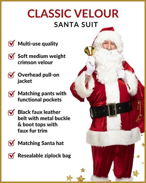 Get ready to spread the Christmas cheer when you grant children's wishes, give out gifts and more in our Classic Velour Santa Suit Mens Plus Size Christmas Costume. This Santa suit is perfect for corporate events, shopping malls, entertainers and even parents to dress up as Santa for Christmas events. The suit comes with a bright red comfortable velour fabric jacket, featuring fluffy white faux fur trimming down the chest, across the hemline and at the wrists, as well as a pull over design with velcro fastening at the back of the neck. Matching red velour pants with an elastic waistband are also included as well as featuring workable pockets at the hips. Complete your costume with the matching red Santa hat with a fluffy white trim and pom pom, the included shiny black boot tops with faux fur trim and matching faux leather black belt featuring an ornate brass-tone real metal buckle that's perfect for different sized Santas! Just add a wig, gloves, some round glasses, and a sack of presents and you're all set. Merry Christmas!