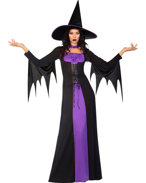 Dress the part this Halloween in an iconic costume with this Classic Witch Womens Costume. The costume comes with a floor length black dress with a purple panel down the centre and a ruched bodice. Below the chest is black lacing details and jagged pieces of black fabric along the long sleeves. There is an included purple choker with a large purple jewel in the centre and a tall black witch's hat with purple edging. Complete your witchy outfit with accessories from our witches range.