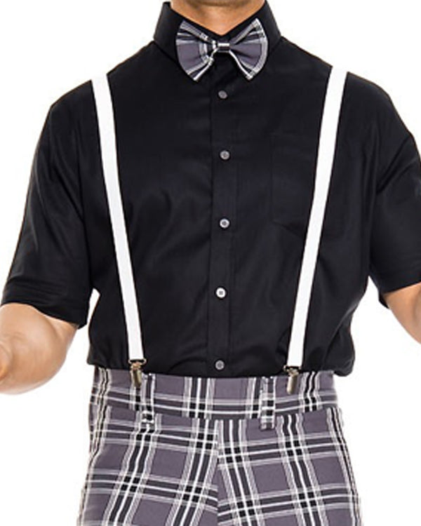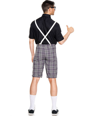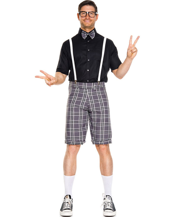 The mathletes and D&D champs are calling out your name so join them in this Classroom Nerd Grey Mens Costume! You'll want to roll with the gangstas but it's so obvious you're white and nerdy. This costume is inspired from the typical nerdy stereotype and comes with a black button up shirt, grey plaid shorts, a matching plaid bow tie and white suspenders. Rule the school one math problem at a time!