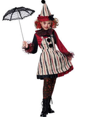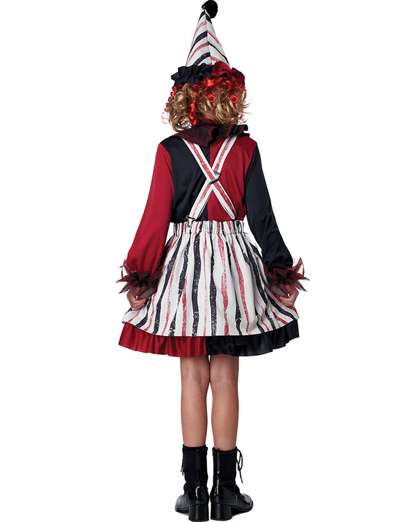 Turn from cute to creepy at the circus or next Halloween event in this Clever Clown Girls Costume. This costume includes an off-white dress with red and black vertical stripes, a pair of matching suspenders, a black and red long sleeve top, a black and red petticoat, a dark red ruffle collar and a pair of matching ruffle cuffs. For the finishing touch in an included cone-shaped off-white hat with red and black stripes with a black pom pom on the top and along the edging is black and red ruffles.