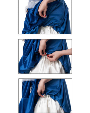 This Colonial Era Dress Girls Costume would be perfect for historical days at school. The dress doubles as both a colonial era inspired as well as a Martha Washington costume. The costume includes a dark blue and white dress with a combined over and under skirt. The dress features elbow length trumpet sleeves, pointed shoulders and blue ribbon detail. The blue over skirt can be worn free flowing or buttoned in the back for a draped look. Also included is a transparent mop cap with blue ribbon.