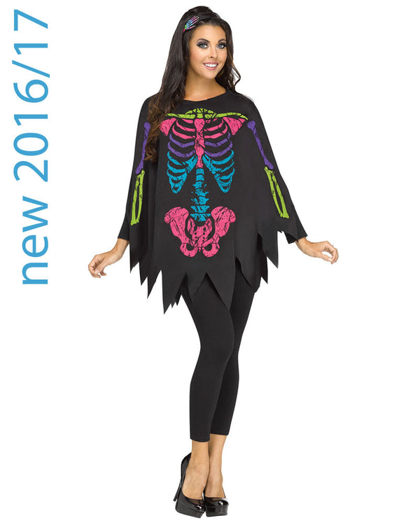 This Colour Skeleton Womens Poncho is a great idea for a quick costume for a Day of the Dead party or Halloween. This black poncho features a pink, purple, green and blue skeleton bone print on the front. Just add a pair of black leggings for a complete look.