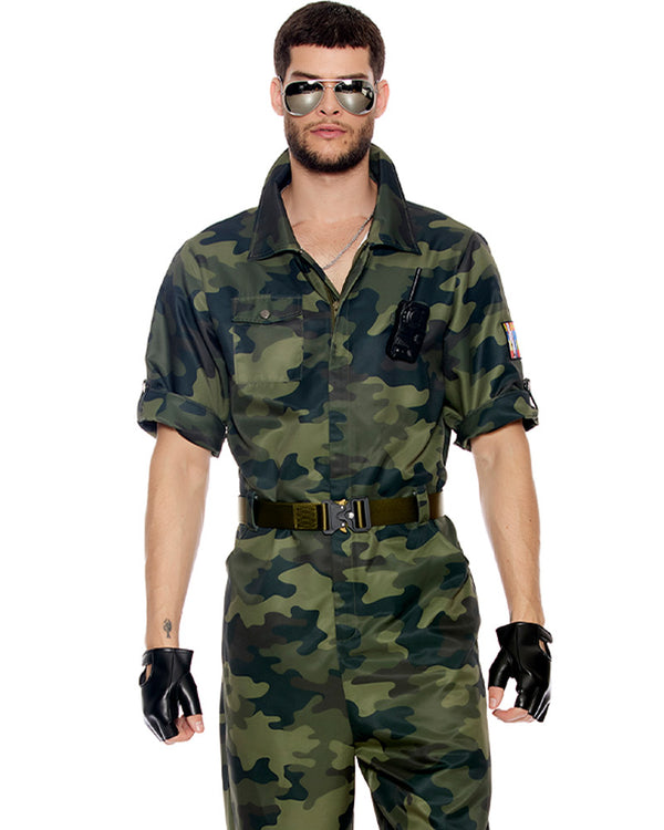 Gear up and embrace your inner warrior with our Combat Ready Military Mens Costume. This commanding ensemble is designed for those who exude strength, confidence, and the spirit of the military. Step into the spotlight with our camouflage printed jumpsuit featuring short cuffed sleeves, zip-front and collar. Its authentic design, complete with snap button chest pockets and gathered elastic hem, captures the essence of military uniforms. You'll feel ready to take on any mission that comes your way. Also included is aviator glasses, a black belt, black fingerless gloves and a walkie talkie prop, which adds an extra level of authenticity to your outfit. Whether you're attending a costume party, participating in a reenactment, or simply embodying the warrior spirit, this costume will make you feel like an alpha, ready to take charge and lead the way.
