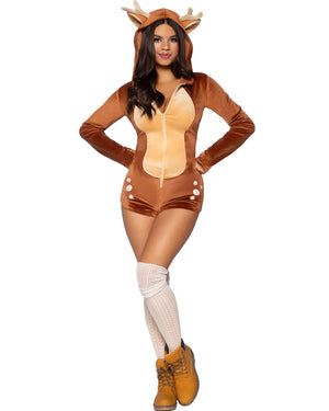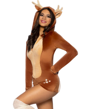 Add a cute twist to your reindeer outfit this Christmas with this Comfy Reindeer Womens Costume. The costume comes as a soft brown plush velvet romper featuring a zip-up front, long sleeves, cheeky booty shorts, an attached deer tail and an attached hood with ears and antlers attached. It's perfect for Christmas or any animal themed event, or even just to laze around your home, just add makeup and accessories to suit the occasion.
