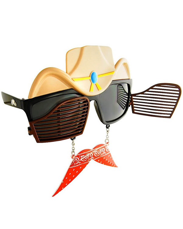 Giddy up. These Cowboy Glasses with Bandana Moustache will have you feeling like a rootin' tootin' cowboy in no time. These black glasses feature brown shutter saloon doors that open and close. A plastic cowboy hat is attached to the top of glasses, while a red bandana moustache is attached to the glasses with a chain. Perfect for Wild West parties, Halloween costumes, or just adding some cowboy cool to your everyday style.
