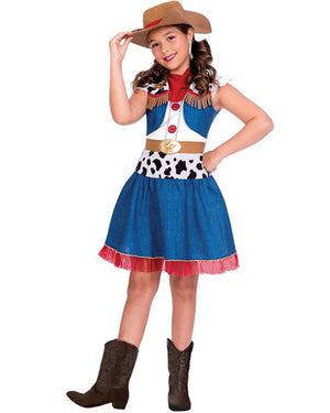 Dress like an outlaw wearing our Cowgirl Cutie Girls Costume. Featuring a white and blue old-western style dress styled with red tassels attached to the hem and black and white cow print. The costume comes complete with a red necktie and a brown cowgirl hat with a red hat ribbon.