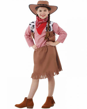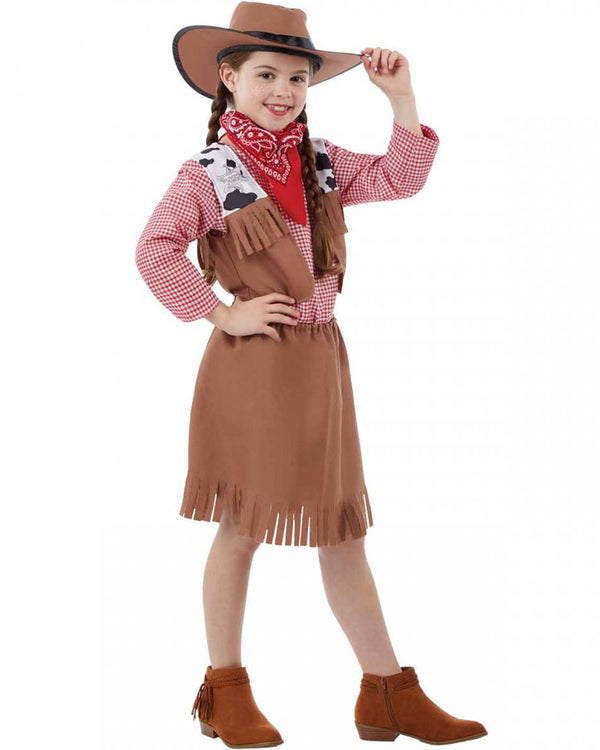 She'll have a wonderful time as a wild west girl in this Cowgirl Girls Costume. This 5-piece cowgirl set has everything you need for the ultimate dress-up. Included is a red and white check shirt, a faux suede tassel waistcoat featuring black-and-white cow pattern, and a matching faux suede skirt. Completing this outfit is a brown, broad-brimmed, leather-look cowgirl hat and a classic red paisley print bandana. Just add cowgirl boots and she's ready to go! Perfect for children's dress-up parties, historic fancy dress, or for dressing up as her favourite cowgirl character from a book, TV series or film.