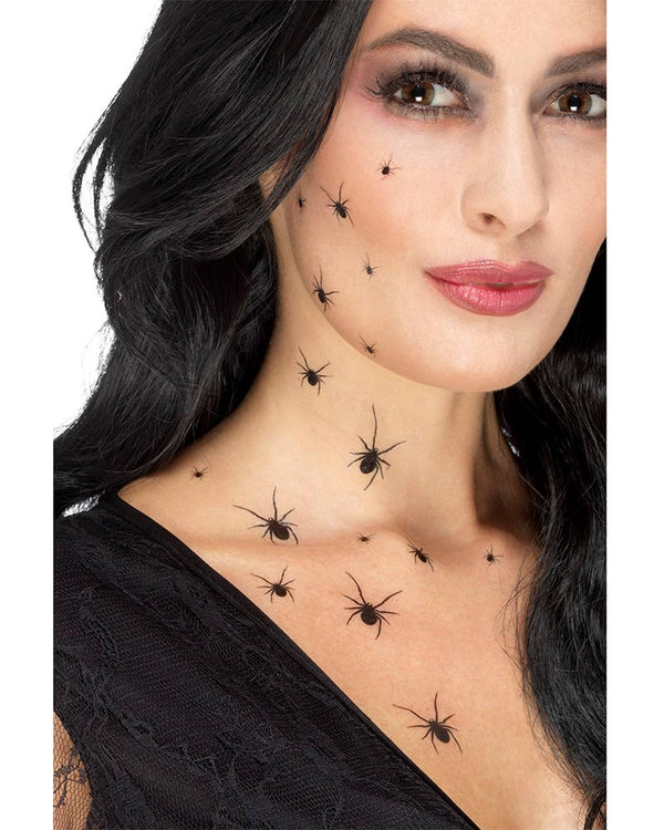 Give your friends the hibbie jibbies when you turn up to your Halloween party with this Crawling Spiders Tattoos down your neck or other parts of your body. This accessory includes two sheets of tattoo transfers with 18 black spiders on each, in a range of sizes. Easy to apply, these tattoos are perfect for adding to a huge number of costumes and outfits.