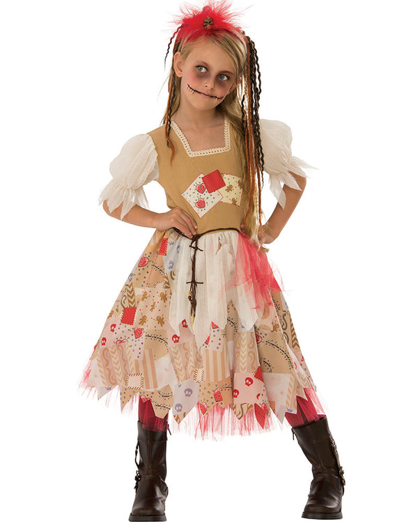Celebrate Halloween with a little mythical magic in this Creepy Voodoo Doll Girls Costume. The costume includes a dress with a textured brown bodice featuring images of patchwork material. The sleeves of the dress are made out of a white mesh material that are puffed with a raw zigzag hem. The bottom half of the dress has a red tulle underlay and features the same patchwork print all over and a zigzag hemline. To complete the look, also included is a headband with attached hairpieces in three different colours and a skull pendant with tulle embellishment.