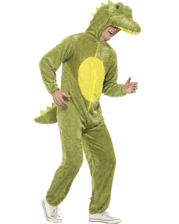 Transform yourself with this Crocodile Mens Costume a lightweight two tone green furry costume with zip at the front and soft spikes down the back and tail.