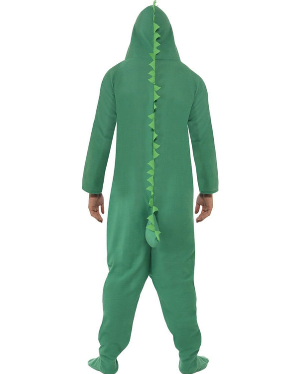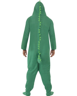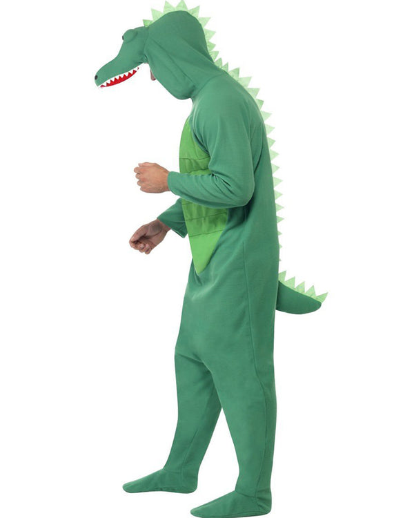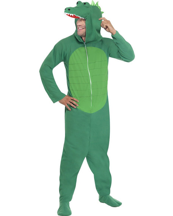 They say you should never smile at a crocodile, but party guests won't be able to resist when you walk in wearing this Crocodile Mens Costume. This costume includes a green plush jumpsuit with a light green oval tummy on the front, a pair of attached foot covers, and a zipper down the front. The hood features a stuffed crocodile head with a red mouth along the bottom, light green spikes down the back and white pointed teeth inside the mouth.