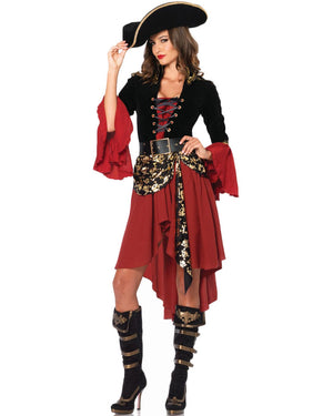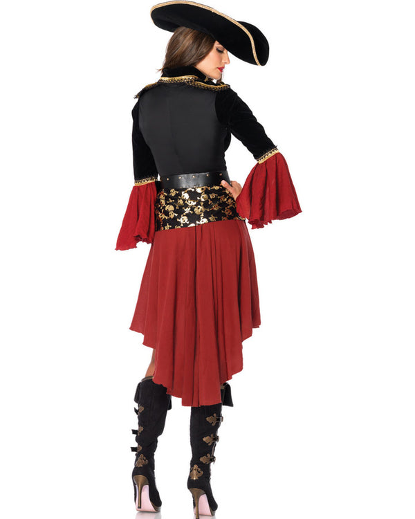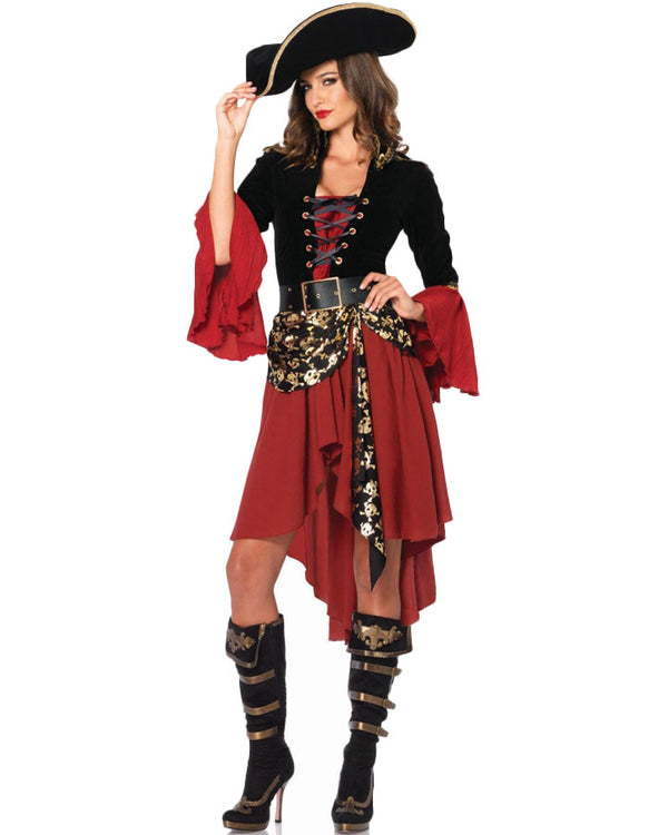 This Cruel Seas Captain Womens Costume will have the scurvy landlubbers under control quick enough we reckon! Featuring an alluring high/low hemline dress in burgundy with an attached velveteen black jacket with lace up front and attached sash decorated with gold skulls and completed with a wide faux leather belt. Fabulous quality.