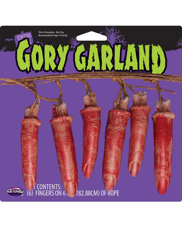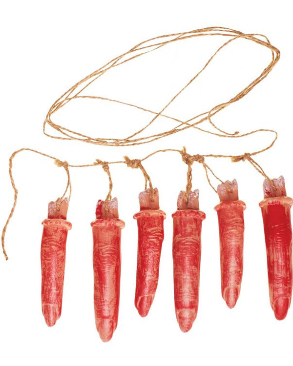 If you're after blood and gore themed decorations then this Cut off Fingers Garland 1.8m is for you. Included is a brown string garland with 6 bloody fingers attached.
