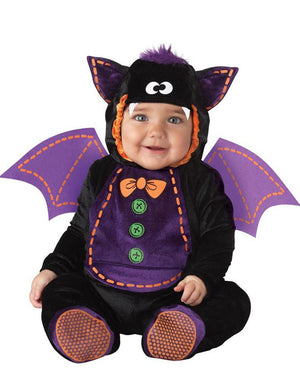 This adorable Baby Bat Infant and Toddler Costume includes a hood with plush tuft on the top of the head, detachable wings, a printed jumpsuit with snaps for easy diaper change and skid resistant feet.