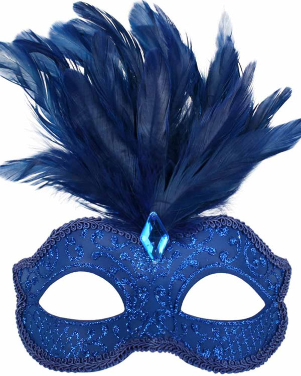 Don this beautiful Daniella Blue Feathered Masquerade Mask to go out to your Masquerade ball or a glamorous party. Blue satin hard plastic mask with beautiful beaded trim and a blue feather plume. Ties at the back with thin satin ribbons. Very dramatic!