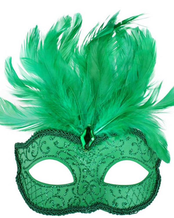Don this beautiful Daniella Green Feathered Masquerade Mask to wear to your Masquerade ball or glamorous party. Green satin hard plastic mask with beaded trim and a green feather plume. Ties at the back with thin satin ribbons. Very dramatic!