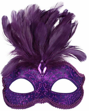 Don this beautiful Daniella Purple Feathered Masquerade Mask to go out to your Masquerade ball or glamorous party. Purple satin hard plastic mask with beaded decoration and purple feather plume. Ties at the back with thin satin ribbons. Very dramatic!