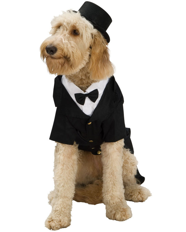 Have your dog looking adorable for formal occassions in this Dapper Dog Pet Costume. This costume includes a black doggie tuxedo jacket with an attached white shirt front, black tie and tail and a matching black top hat. Very cute!