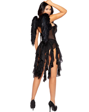 Descend from the depths below in this breathtaking Dark Angel Diva Women's Costume. This sexy costume includes a black sheer strapless bodysuit with a pair of silver angel wings on the bodice and pieces of black shimmer twisted material attached around the back. Pair this costume with some black wings, a pair of divine footwear and a touch of glitter. Perfect for costume parties, Themed parties and much more.