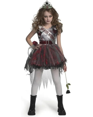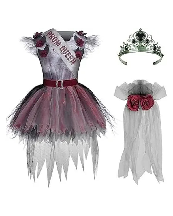 Prom just got a whole lot spookier with this Dark Prom Girls Costume. This stunningly detailed costume features a sleeveless dress with a silver bodice adorned with dark red roses, perfectly complemented by a "Prom Queen" sash and tulle shoulder accents. A dark red belt with a silver buckle cinches the waist, while the skirt layers in dark red, black, and grey fabrics with tattered trims enhance the look. The grey train at the back, edged with zig-zag trims, adds a dramatic flair. The costume is completed with a dark red rose corsage accented with grey tulle and a silver tiara crowned with ruby red embellishments. Reign the night with this dark, yet equally chic costume at your next Halloween or zombie themed party.