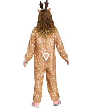 This adorable Darling Deer Girls Costume is the perfect choice for Book Week or your next Fantasy, Forest or Animal party. The costume comes in a soft, full-length jumpsuit in brown with metallic gold spots, featuring a a deer tail at the back. Also included is a headband with deer ears and two antlers, as well as pink flowers in the center. The costume features a zipper down the front for ease of wear so grab this comfy costume for your next fancy dress party or even just to wear around the house.