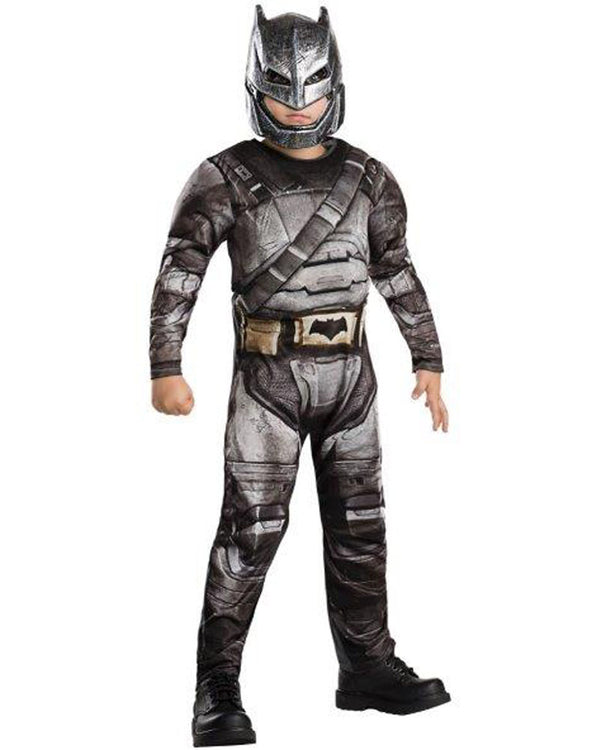 Any die hard superhero fan will love this new version based on the Superman v Batman movie. The Armoured Batman Deluxe Boys Costume is inspired by the new look Batman played by Ben Affleck and looks just like the real deal! A polyester padded muscle chest jumpsuit is printed with a body contouring design featuring a belt and body strap, with a matching full face mask.