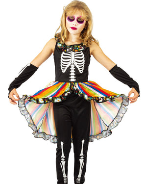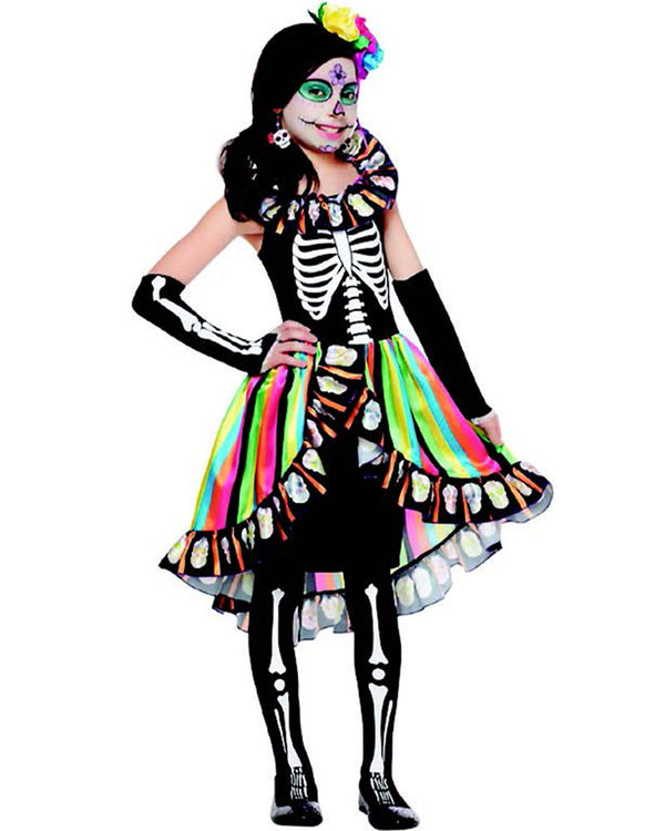 Celebrate the Day of the Dead in style with our Day Of The Dead Girls Costume, a tribute to the vibrant Mexican holiday. This costume includes a black dress adorned with a skeleton ribcage on the chest, capturing the essence of the Dia de los Muertos celebration. The skirt of the dress features multicoloured striped and sugar skull pattern trim, adding a festive touch to the spooky ensemble. With matching black fingerless gloves featuring a skeleton print and coordinating stockings, your child will be ready for a hauntingly beautiful Halloween.