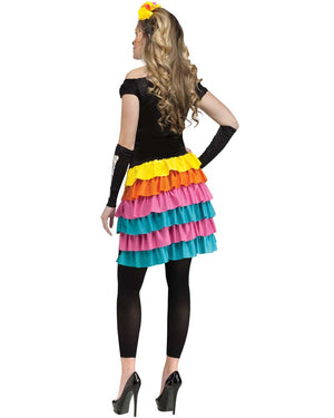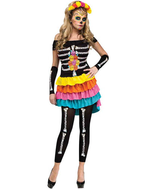 This Day of the Dead Rainbow Womens Costume is perfect for Halloween, Day of the Dead, or any party you need to look freaky! Featuring a dress with a ribcage print and coloured tiered skirt, matching bone print leggings, sleevelets and a flower headband.
