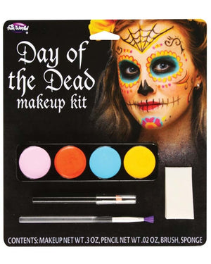 To complete the look of your day of the dead costume you will need this Day of the Dead Rainbow Womens Makeup Kit. This complete kit includes a makeup palette with 4 colours, a makeup pencil, makeup brush and sponge.