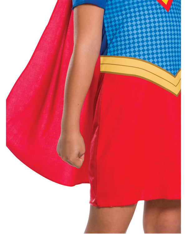 Your little girl will be flying higher than a plane and become stronger than an ox in this DC Super Hero Girls Supergirl Girls Costume. The costume comes with a digitally printed t-shirt dress featuring a blue patterned top with the Supergirl logo across the chest. The dress comes with a red detachable cape and the skirt of the dress is red and comes with an attached gold belt. To complete the costume, a white satin covered headband is also included. Get ready to save Gotham with the rest of the DC Super Hero Girls.