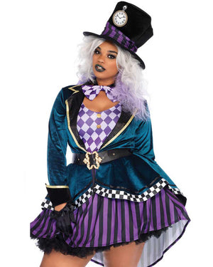 No one will throw a better tea party than you when you wear this Delightful Hatter Plus Size Womens Costume! This costume is styled as the Mad Hatter from the novel and film Alice in Wonderland and features a checkerboard trimmed velvet high-low coat dress, a belt with an ornate buckle, a bow tie and a matching oversized top hat. We're all mad here!