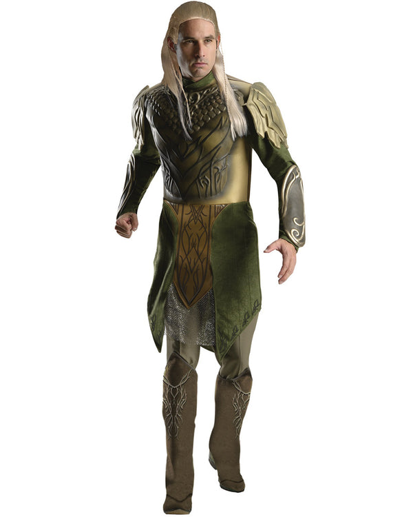 Dress up as your favourite elf with this Deluxe Legolas Greenleaf Mens Costume. This officially licensed costume is styled after the costume worn by Legolas in the Hobbit movies. It features a tunic with moulded foam breast plate and moulded shoulder guards that attach with Velcro. It also comes with foam boot tops. The whole costume is coloured in gold and green tones.