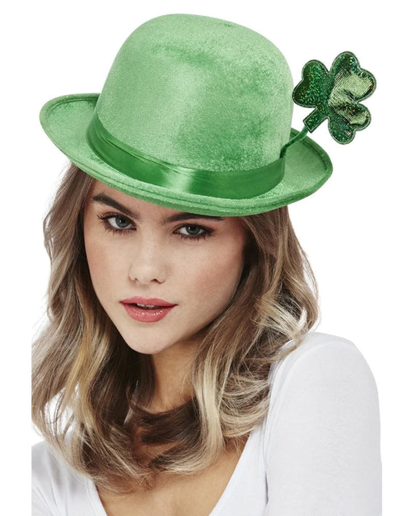 You'll look deadly gorgeous in this Deluxe Paddys Day Bowler Hat. The perfect accessory to complete your St Patrick's Day look, included is a velour bowler hat in pastel dark sea green, with a matching green band and protruding, glossy green shamrock motif decoration. Grab a green cocktail and get ready to party! Add other matching St Patrick's day accessories for a perfectly coordinated look.