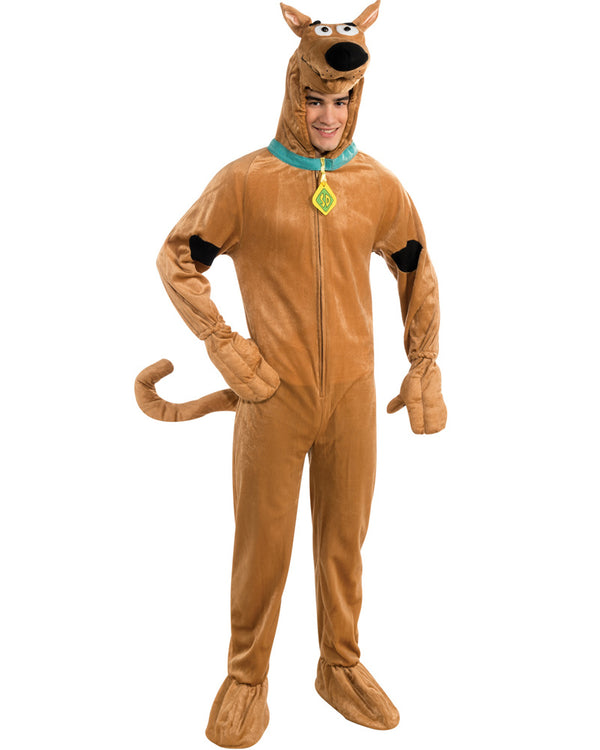 Get ready to solve some mysteries and get a whole lot of scooby snacks in this Deluxe Scooby Doo Mens Costume. This full-length, hooded velour jumpsuit is as cosy as it is fun, featuring a front zipper closure for easy wear. You'll love all the authentic details, from the fibre-filled tail and paws that slip over your hands to the perfectly sculpted Scooby-Doo character hood, complete with a blue collar and a classic "SD" dog tag. Attached shoe covers complete the look, so you'll be ready to jump in the Mystery Machine and have a great time at any movie themed or Halloween party.