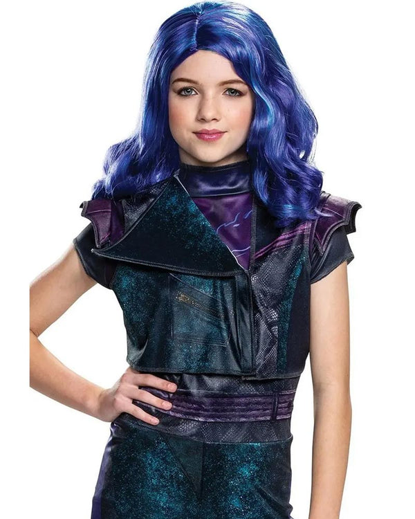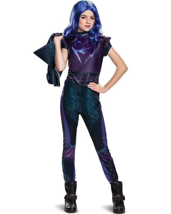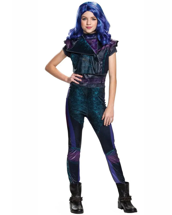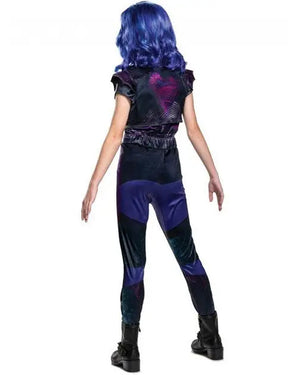 Become the queen of the United States of Auradon when you wear our Descendants 3 Mal Classic Girls Costume. Inspired by the main protagonist from Disney’s Descendants franchises. Mal is the daughter of Maleficent and Hades, the costume features an iridescent blue and purple jumpsuit with a stylised print of Mal logo on the front and back. The costume also comes with a matching sleeveless vest with a large folded lapel and Velcro fastening on the front.