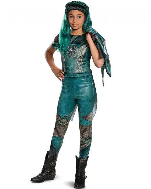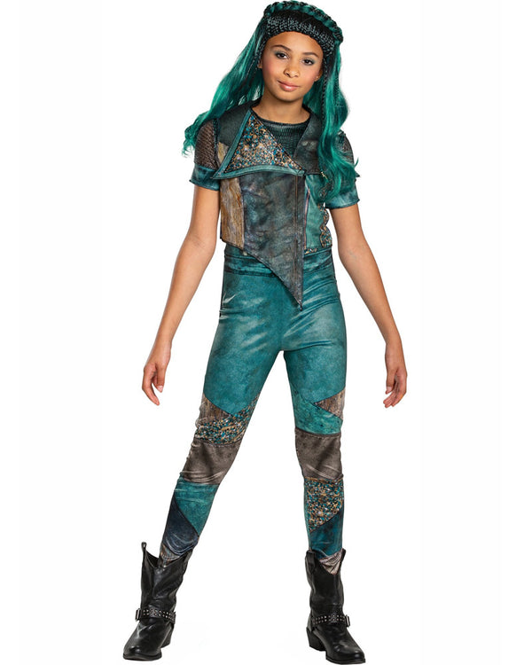 Any Descendants fan would love our Descendants 3 Uma Classic Girls Costume. Inspired by the daughter of the villainous Ursula from the Descendants series. Featuring a green jumpsuit with an attached mermaid tail and a detachable jacket with a large folded-over lapel and velcro enclosures. Great to wear for Halloween.