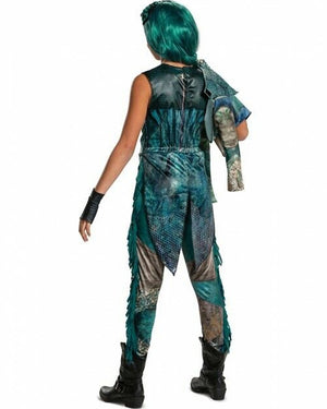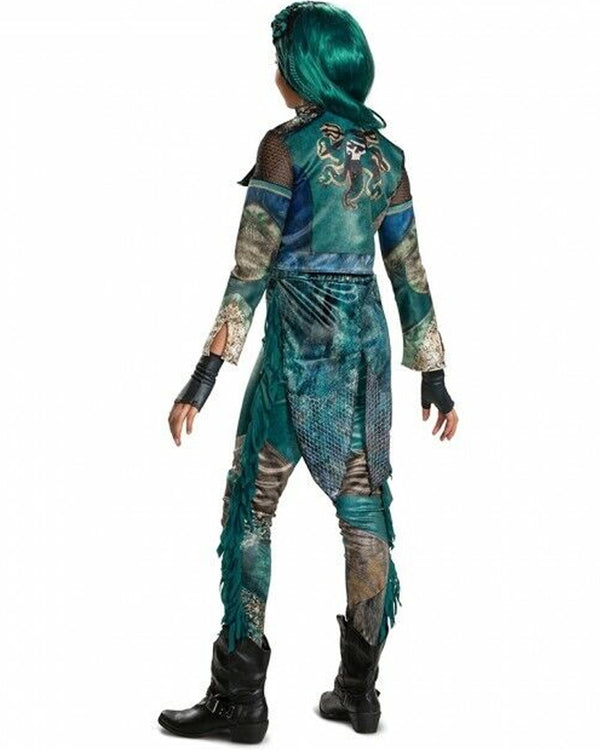 Any Disney fan would love our Descendants 3 Uma Deluxe Girls Costume. Inspired by the daughter of the villainous Ursula from the Descendants series. Featuring a deluxe green jumpsuit with a mermaid tail, tassels down the legs and the Uma logo on the front and back. The costume also comes with a long sleeve detachable jacket with a large folded-over lapel and a zipper enclosure. Great to wear for Halloween.