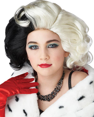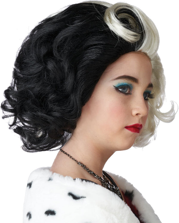 This glamourous Devilish Diva Short Black and White Kids Wig is a fantastic way to complete your Cruella De Vil costume. Whether for your next Book Week event or villains party, this two-tone wig is perfect featuring a short half black and half white hairstyle just like Cruella. Wear a wig cap for added comfort and to keep your own hair under wraps.