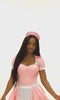 Dress in this Dine and Dash Womens Costume for an unforgettable look for your next fancy dress. This diner hostess costume features a pale pink vinyl collared bodysuit with short sleeves, a sweetheart neckline and round black and white nametag printed on the left chest. Along the bottom of the bodysuit are pink garters. A matching mini skirt to wear over the bodysuit includes an attached mini white apron and a matching headband to place on your head. Complete your uniform with a pair of thigh highs, sexy heels and a pen and notepad.