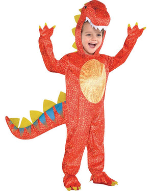Step into the prehistoric era with our Dinomite Dinosaur Kids Costume. This adorable costume features an orange scale pattern jumpsuit with a yellow round chest. There are attached dinosaur-shaped shoe covers, dinosaur feet-shaped cuffs and a large attached plush dinosaur-shaped tail with yellow soft spikes. There is an attached matching hood with a plush dinosaur head on the top. A great costume for any fancy dress event.