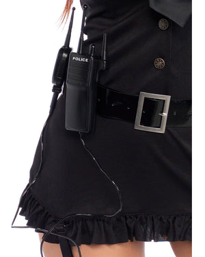You won't have any trouble getting attention in this sexy Dirty Cop Womens Costume. The costume comes with short and sweet black police button front dress featuring a police badge and frilled hemline with attached garter straps. Also included is a black police hat with badge, short black neck tie, leather look fingerless gloves, black belt with silver buckle and of course, a faux walkie talkie.