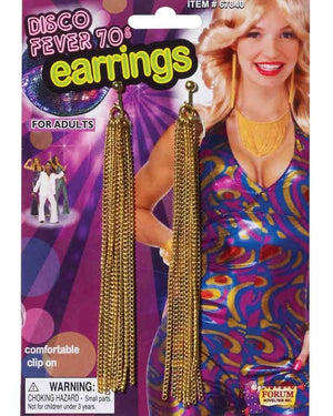Don't forget to accessorise your 70's costume with the perfect finishing touch, also known as these Disco Gold Chain Clip On Earrings. These earrings are a classic and will look great with your disco costume as they come in gold and feature studs with dropping chain detail! What's more, the earrings are clip on meaning you don't need to have your ears pierced to wear them! Once you have all your accessories together you will be able to bust some moves. Bring on the disco fever.