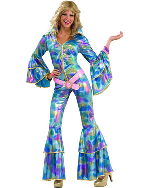 Those Super Trooper lights are gonna find you in this fabulous Disco Mama costume. Includes a multi-coloured metallic jumpsuit with bell bottoms and sleeves and a sparkly pink tie-on belt. Just add a shimmy and a shake! Perfect as part of a group costume for ABBA.