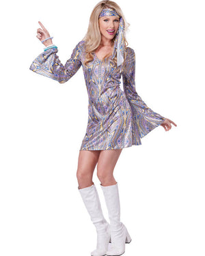 Dance the night away in this Disco Sensation Womens Costume. This sensational outfit includes a colourful sequined long-sleeved dress with flared sleeves and skirt which comes above the knee. It also comes with a matching head tie to complete the look. Pair with some gogo boots to really get into the groove. Perfect outfit for any 70s themed parties.
