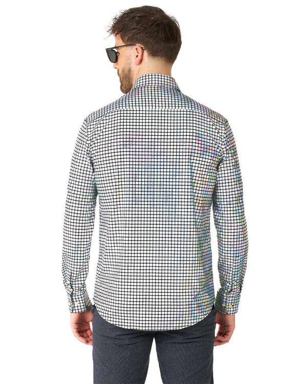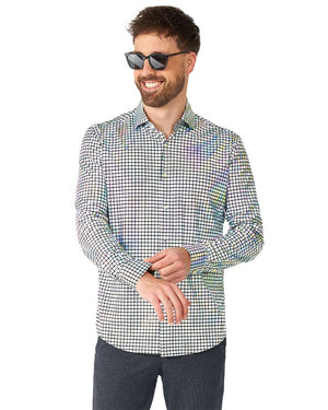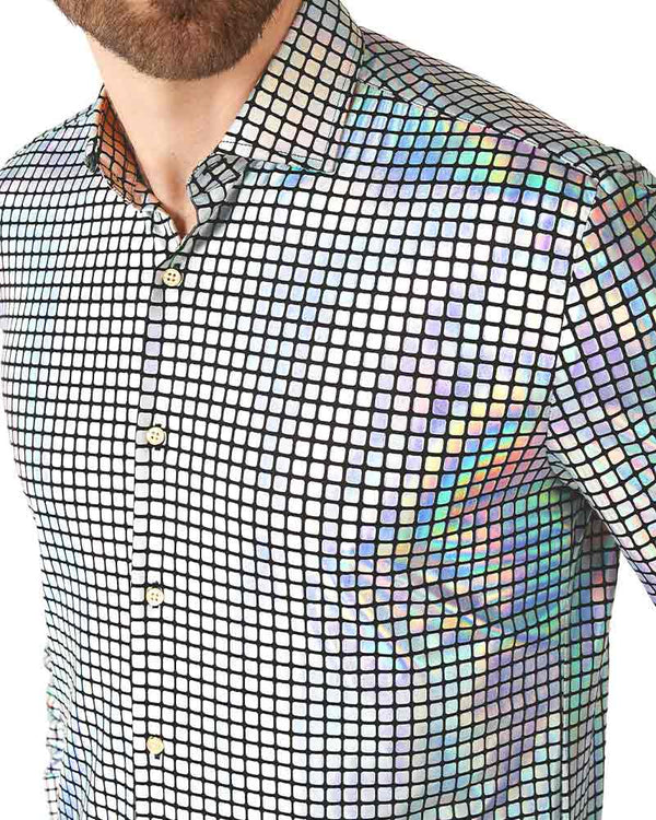 Show up to the Disco and be known as the Discoballer in this Discoballer Opposuit Mens Shirt. This premium button-up shirt features a dazzling silver background with colour projection throughout. This shirt shines bright and all it needs is you to make it shine even brighter. This Discoballer shirt doesn't miss a beat and is a perfect fit for your next 70s party or even your next dress up party. Get ready to shine the dance floor, what's a disco without the Discoballer? Check out our range of dazzling Opposuits for a complete and coordinated look.